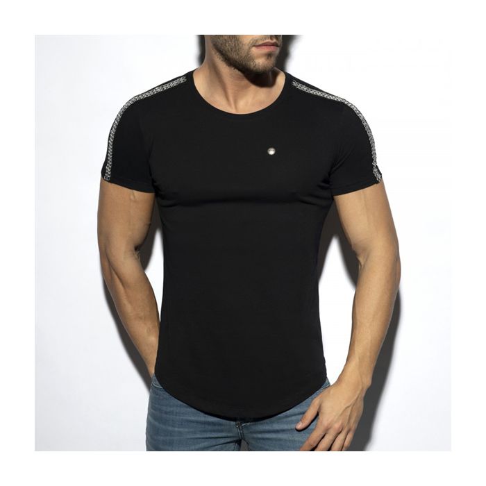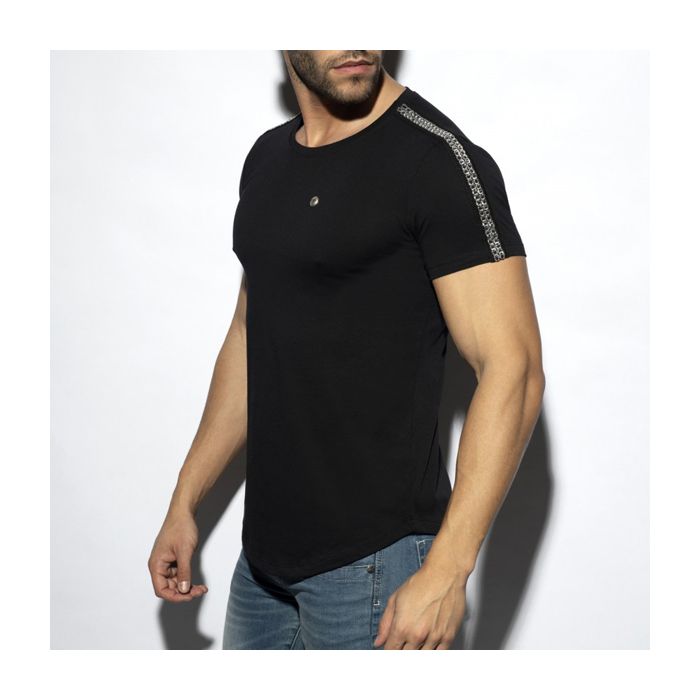 Het ES Collection Chains T-Shirt - Zwart is een stijlvolle basic. Het t-shirt is gemaakt van 100% katoen van hoge kwaliteit. Het katoen is zacht en luchtig. Het t-shirt heeft een normale pasvorm, korte mouwen en een ronde hals. Onderaan is het t-shirt afgerond. Op de borst is een metalen ES embleem aangebracht. Over de schouders lopen kettingen en zijn grove sier zomen aangebracht. Dit maakt het t-shirt net wat specialer dan een standaard t-shirt.
