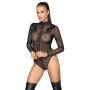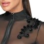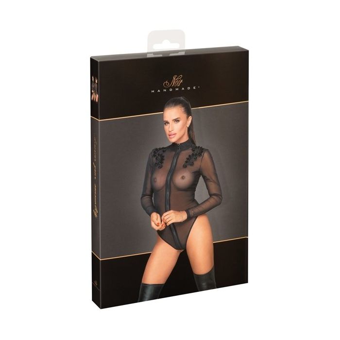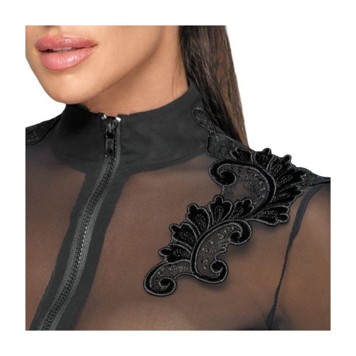 De body heeft charmante lange mouwen en een stijlvol opstaand kraagje. De voorkant is voorzien van een rits die vanaf de hals tot op het kruis loopt. Op de schouders zijn sierlijk geborduurde details aangebracht wat zorgt voor een erg luxe uitstraling.