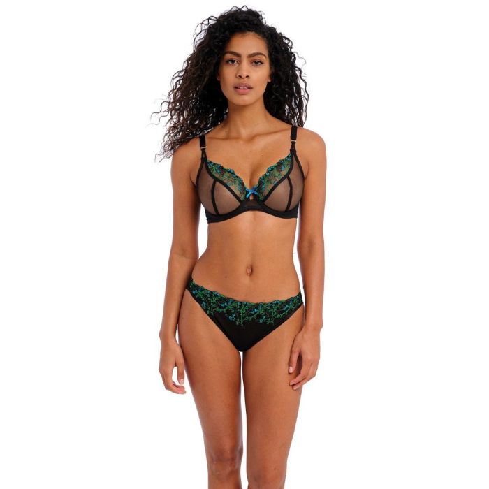 De Show-off Beugel Bh - Zwart van het merk Freya is een zeer gewaagde bh uitgevoerd in een schitterende luxe uitvoering. De sexy bh is voorzien van zachte materialen en dankzij de gekleurde details in het groen en blauw krijgt de bh een spannende look. Ook beschikt de bh over een goede ondersteuning aan je borsten waardoor je onbezorgd kunt genieten van een intieme avond. Combineer de Show-off Beugel Bh eenvoudig met de bijpassende string en jarretel voor een geweldige look.