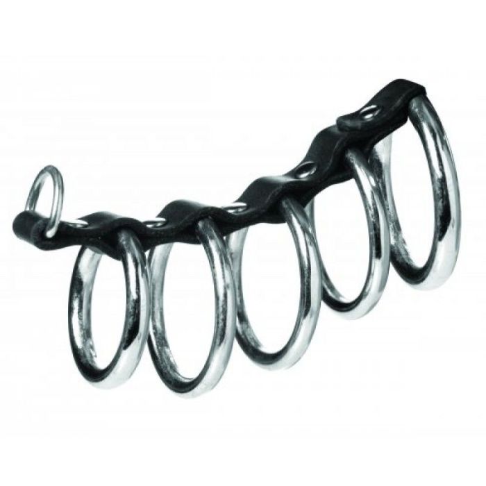 Deze robuuste peniskooi met 5 metalen ringen mag niet ontbreken in de collectie van een echte sub. De compacte peniskooi die makkelijk mee is te nemen is zeer handig in gebruik omdat je simpelweg de ringen om de penis heen schuift. De grootste ring van de peniskooi wordt om de balzak gedragen. Hij is afgewerkt met een kunstleren band die de ringen bij elkaar houd en aan het uiteinde zit een D-ring, hier kan je bijvoorbeeld gewichtjes, kettingen of dunne bondage touwen bevestigen. Helemaal naar jullie eigen fantasie.