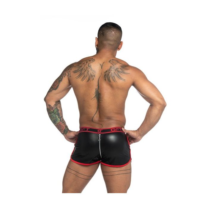 De short is gemaakt van gladde stretch stof dat nauwsluitend om jouw onderlijf zit. Op de elastische tailleband is het GET logo af te lezen in rode letters. De rode kleur komt terug in de zomen onderaan de korte pijpjes. Over het kruis loopt een 2-way rits. De rits loopt vanaf de voorkant helemaal door naar de achterkant voor een uitnodigend effect.