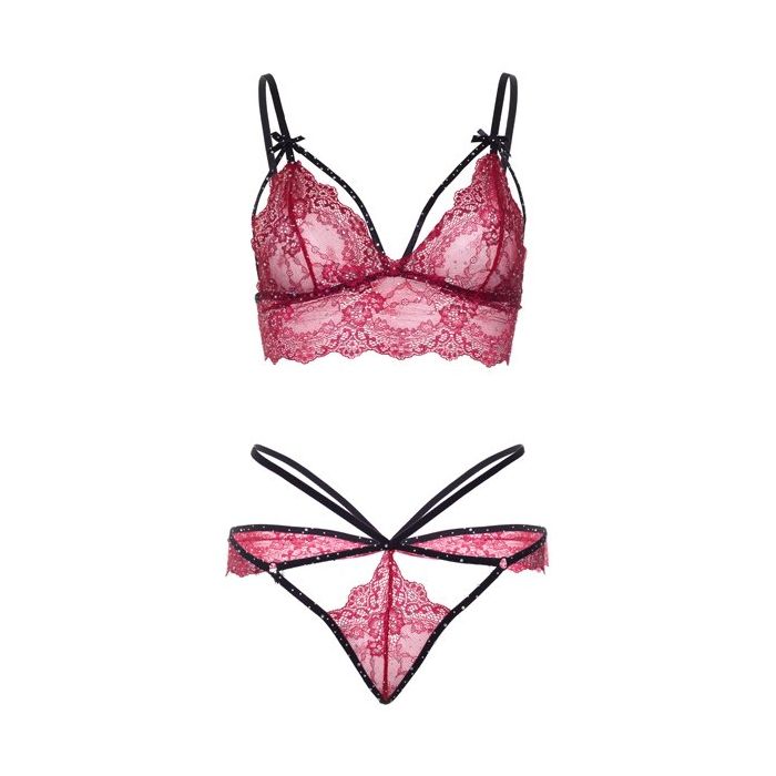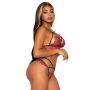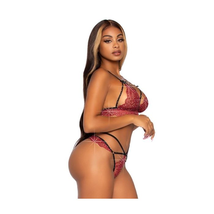 De Glitter Bralette en G-String - Bordeaux van Leg Avenue bestaat uit een bralette bh en G-string, beiden gemaakt van prachtige bloemen kant. Het bloemen kant schijnt sexy door en is versierd met schitterende strass steentjes.