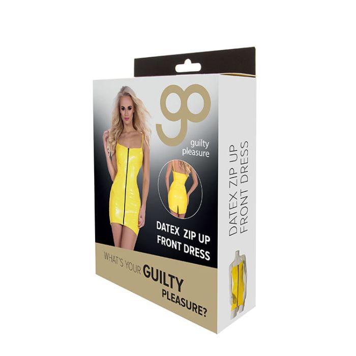 Een geel mini jurkje van het merk Guilty Pleasure. Het jurkje is gemaakt comfortabel datex materiaal. Datex is een combinatie van latex en stof. De buitenlaag van het jurkje is latex terwijl de binnenkant van stof is. Daardoor is het jurkje eenvoudig aan en uit te trekken. De voorkant is voorzien van ritssluiting die je volledig kunt open ritsen. Wil jij graag opvallen? Bestel dan de GP Datex mini jurkje met rits.