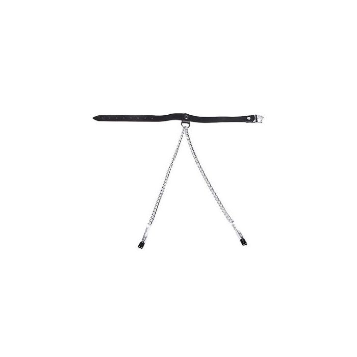 Met deze halsband met tepelklemmen aan een ketting komen al je stoutste dromen uit. De halsband die extra kettingen met klemmen heeft die op de tepels kunnen worden geklemd zorgen voor een extra spannende beleving in de slaapkamer. Doordat er ook een een halsband aan zit kunt je je ook volledig laten domineren door je partner door hier nog een riem aan te bevestigen. De klemmen zijn verstelbaar in sterkte waardoor je precies de goede grens van pijn op kunt zoeken.