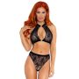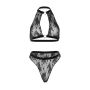 De bijpassende kanten string heeft een hoge taille. De halter top en de string zijn beiden afgewerkt met zomen van zacht fluweel.