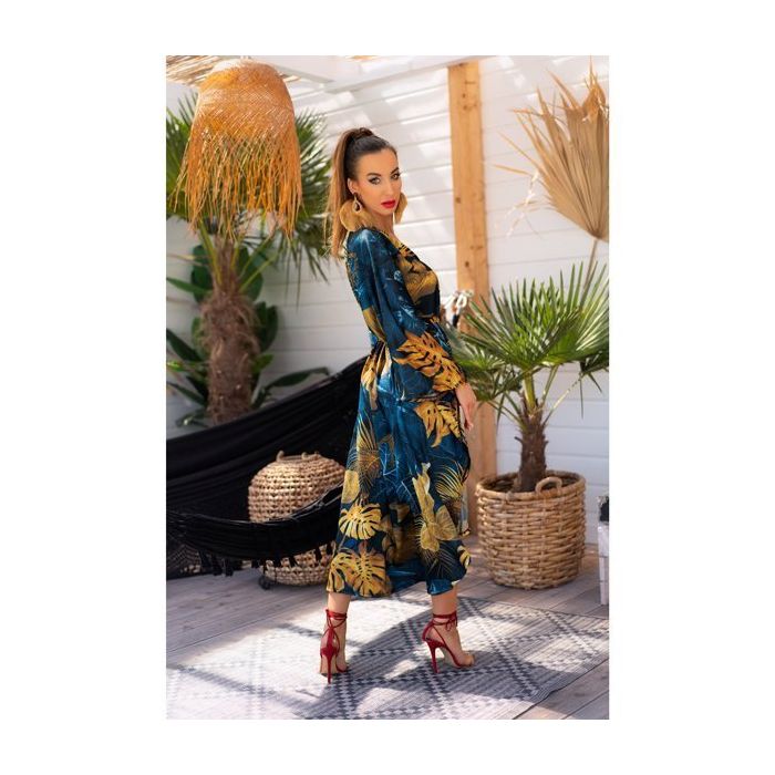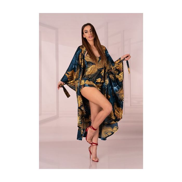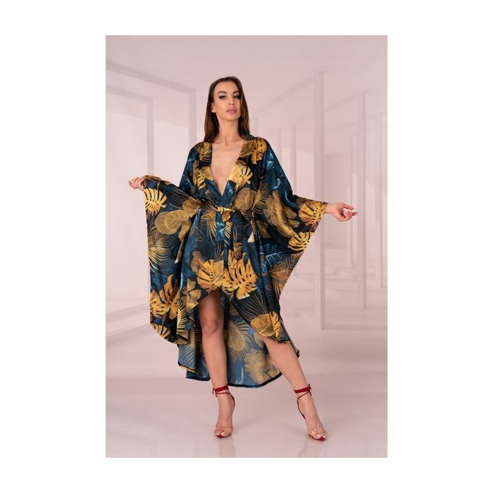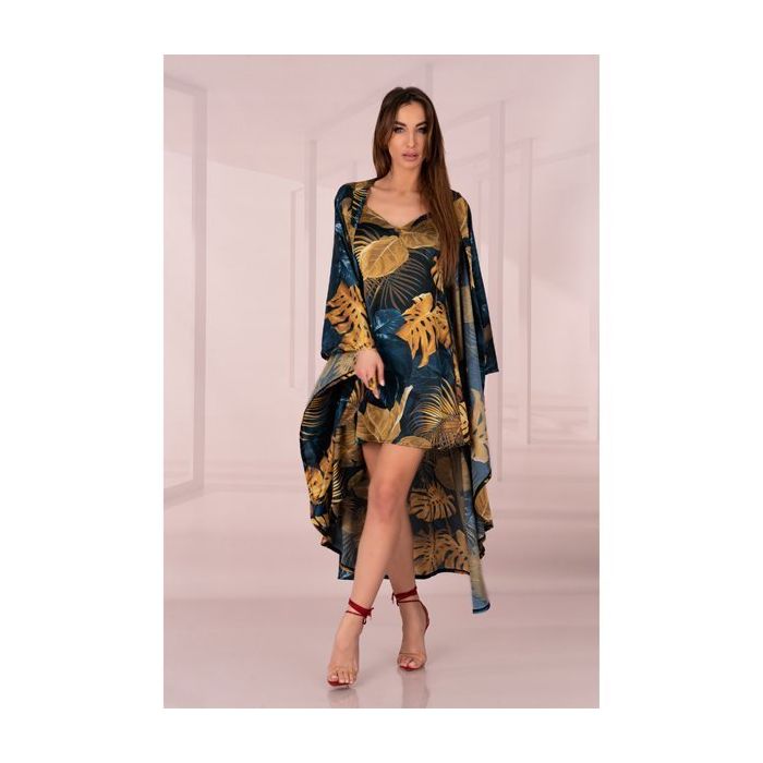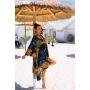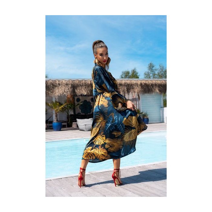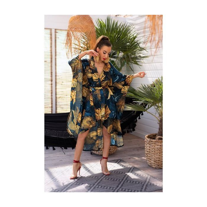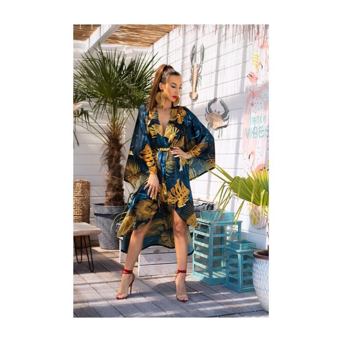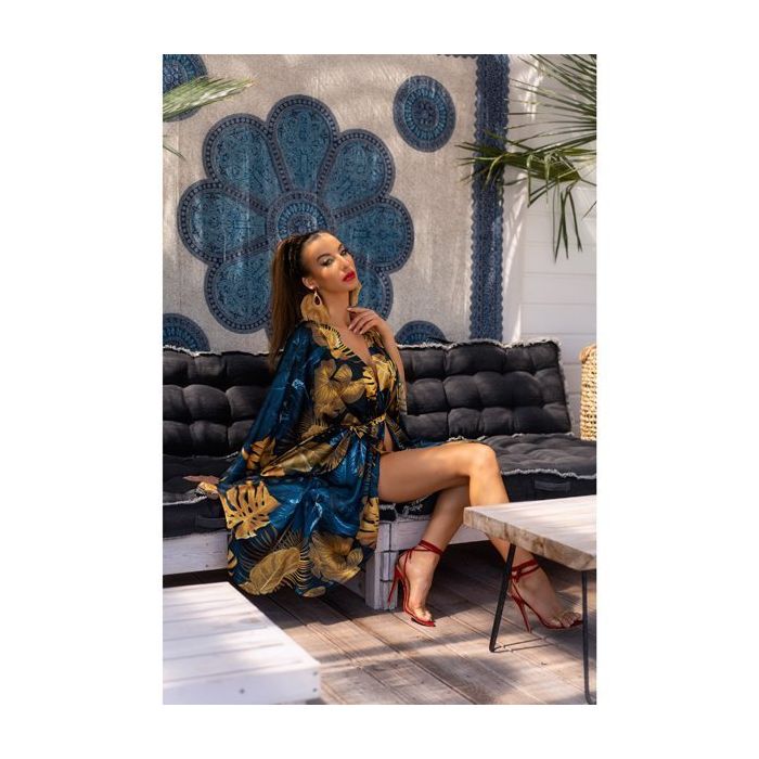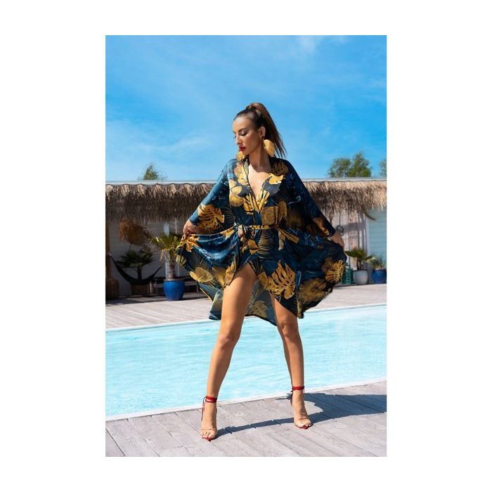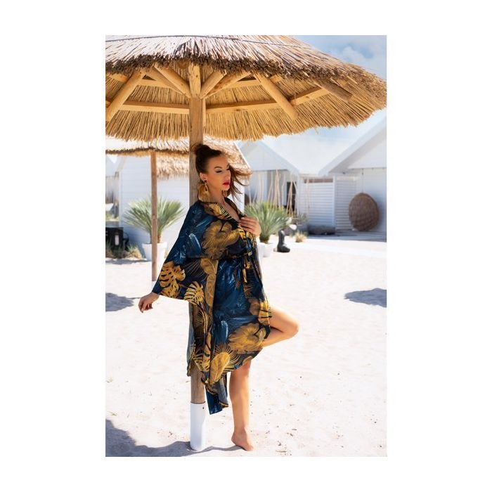 Ga voor een stijlvolle beach look met de Handis Kaftan uit de Aquareel Collection van Livco Corsetti! Dit prachtige gewaad is gemaakt van gladde, satijn geweven stof dat sierlijk om jouw lichaam wappert. De stof heeft een tropische print van blauwe en gele bladeren voor een bijzonder mooie en opvallende zomer look.