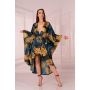 De kaftan heeft een brede boord en een bijgeleverde strik ceintuur. De voorkant is halflang en de afgeronde achterkant loopt langer door dan de voorkant voor een sierlijk effect.
