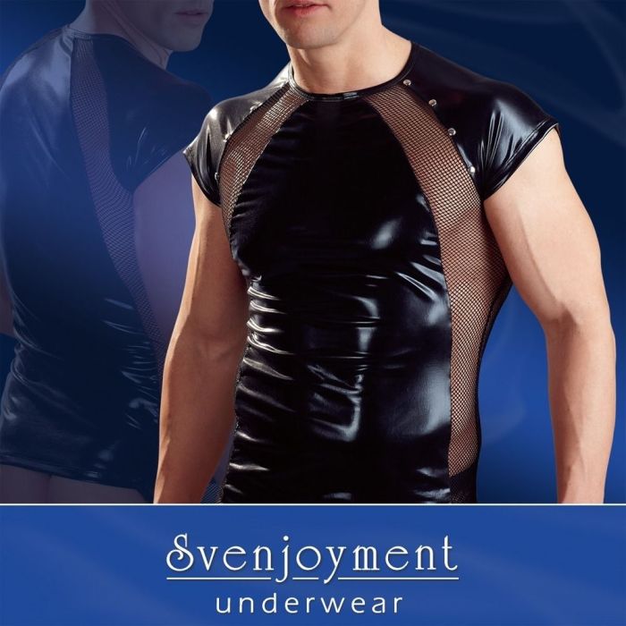 Dit strakke heren shirt uit de Svenjoyment collectie is stoer en sexy. Het shirt is gemaakt van rekbaar wetlook materiaal en afgewerkt met metalen klinknagels en netstof inzet stukken. De wetlook kapmouwen maken je schouders extra breed en het netstof dat langs de zijkanten naar beneden toe loopt accentueert je torso. Trek dit shirt aan wanneer je naar de club gaat of naar een feest en jij zult zeker opvallen op de dansvloer.