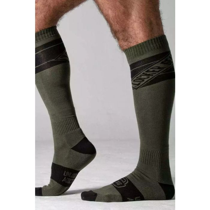 Ontdek de perfecte accessoire om je outfit stijvol af te maken, namelijk met de Hoge Knie Sokken - Khaki. Je kunt deze sokken dragen bij je favoriete Locker Gear jockstrap, singlet, slip of andere uitrusting. De sokken zijn voorzien van strepen, gekleurde patches en Locker Gear-branding. Doordat de sokken op kniehoogte zijn creëer je een sexy uitstraling. Daarnaast zijn de sokken gemaakt van een mix van katoen en nylon. Hierdoor zijn de sokken dik en super comfortabel. Verder zijn de hiel en teen gedempt en hebben ze voetboogondersteuning waardoor de sokken slijtvast zijn en heerlijk zitten!