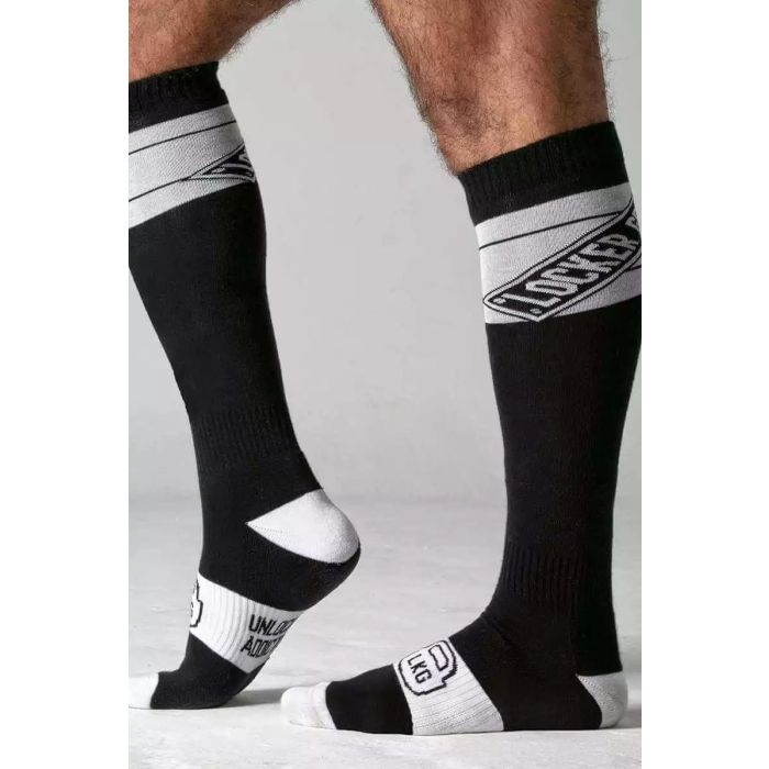 Deze geweldige heren sokken zijn de perfecte accessoire om je outfit stijvol af te maken. Je kunt deze sokken dragen bij je favoriete Locker Gear jockstrap, singlet, slip of andere uitrusting. De sokken zijn voorzien van strepen, gekleurde patches en Locker Gear-branding. Doordat de sokken op kniehoogte zijn creëer je een sexy uitstraling. Daarnaast zijn de sokken gemaakt van een mix van katoen en nylon. Hierdoor zijn de sokken dik en super comfortabel. Verder zijn de hiel en teen gedempt en hebben ze voetboogondersteuning waardoor de sokken slijtvast zijn en heerlijk zitten!