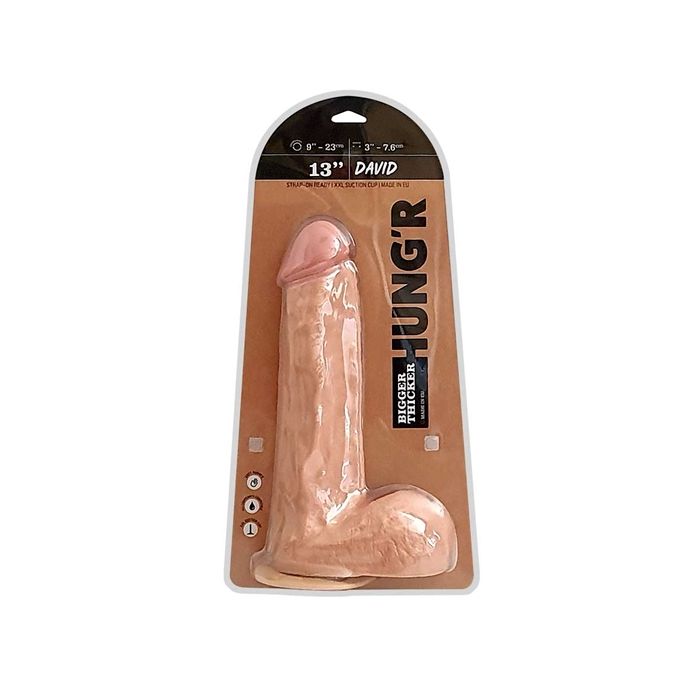 Maak kennis met de HUNG'R David, een indrukwekkende dildo die speciaal is ontworpen voor de enthousiaste gebruikers. Met een lengte van 33 cm en een diameter van 7,60 cm biedt deze dildo een uitdagende en bevredigende ervaring. Gemaakt van zacht PVC, voelt David niet alleen prettig aan, maar is hij ook ontworpen om een realistische uitstraling te hebben. De gedetailleerde afwerking zorgt ervoor dat je het gevoel hebt met een echte partner te spelen. Of je nu alleen bent of samen met iemand anders, David belooft een spannende en plezierige tijd.