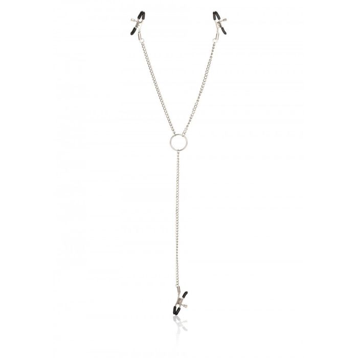 Verbind de meest gevoelige zones met elkaar. Deze 3- delige klemmenset heeft klemmen met vinylbeklede uiteinden, die aan elegante kettinkjes bevestigd zijn. De O-ring in het midden houdt ze bijeen. De klemmen kunnen met schroefje vastgezet worden op een bepaald stand. Hiermee kun je dus de druk op jouw of je partners tepels verhogen en verlagen. De onderste klem kan op een clitoris geplaatst worden maar ook op een balzak of zelfs op de penis (bijv. eikel of voorhuid). Gebruik je kinky fantasie en leef deze maar lekker uit!