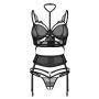 De Jarretel Set Premisis van Obsessive Premium is ontworpen voor de moderne vrouw die haar sensualiteit wil omarmen. De beugelbeha met zachte cups en verstelbare bandjes biedt niet alleen een perfecte pasvorm, maar accentueert ook je rondingen op een verleidelijke manier. De jarretelgordel, met een elegante haaksluiting aan de achterkant, is voorzien van twee verstelbare bandjes die samenkomen in een prachtig borstbeenbandje dat leidt naar een chokerkraag met haaksluiting. De combinatie van fijne zwarte transparantie, sensuele kanten details en decoratieve stretchbandjes zorgt voor een luxe uitstraling, terwijl het zachte en elastische materiaal je de hele avond comfort biedt. En laten we de kleine kanten string niet vergeten, die met zijn strappy stijl en opwindend open kruis een extra vleugje ondeugendheid toevoegt. Maak je klaar om te verleiden op het hoogste niveau!