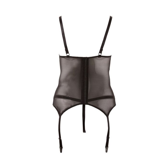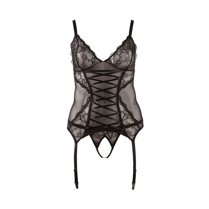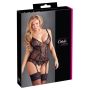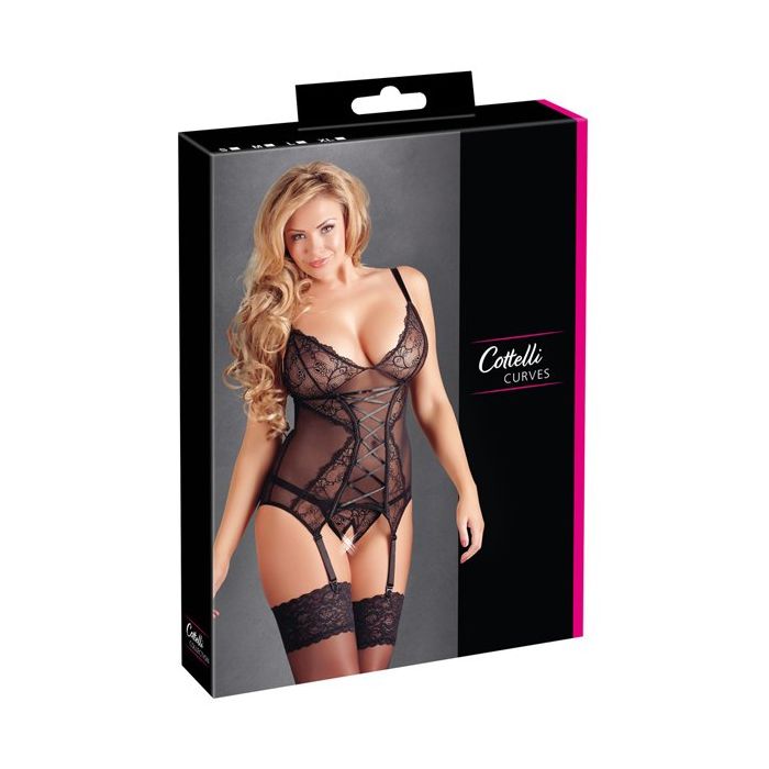 In dit setje van Cottelli Collection zul jij je super vrouwelijk en verleidelijk voelen en je partner zal dit zeker beamen. De set bestaat uit een nauwsluitende korset top met jarretelbandjes en een kruisloze string. De set is geheel gemaakt van doorschijnend tule en is luxe afgewerkt met kant. Het kant, het rijglint aan de voorzijde en de zomen vormen een prachtig lijnen spel over het voorpand van de korset top en slankt optisch af. In dit jarretel setje voel je je op en top vrouw en ga je een hete avond met je partner tegemoet!