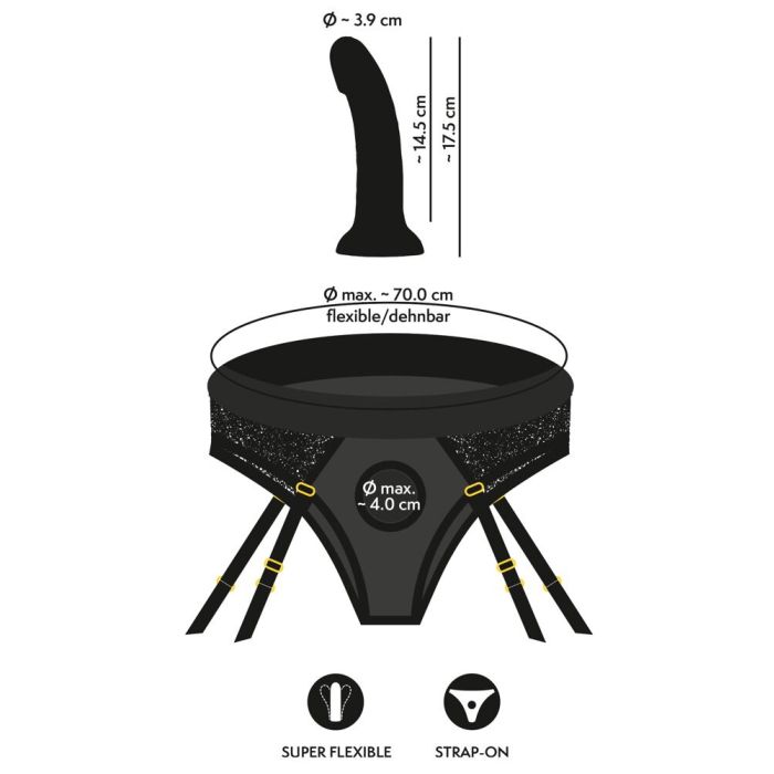 De zwarte jarretelslip is niet alleen stijlvol, maar ook functioneel met verstelbare jarretelbandjes die volledig afneembaar zijn. Met een taille/heupomvang tot maximaal 70 cm past deze slip perfect bij jouw lichaam. De bijgeleverde dildo is gemaakt van zijdezachte siliconen, wat zorgt voor een aangenaam gevoel en een stevige, maar flexibele ervaring. De ideale kromming en de voorgevormde eikel zijn perfect voor G-spot- of prostaatstimulatie, waardoor je samen met je partner nieuwe hoogtes van genot kunt bereiken. En als je even alleen wilt genieten, kun je de dildo met de sterke zuignap op elk glad oppervlak bevestigen voor handsfree plezier. Maak je klaar voor een avontuur vol nieuwe sensaties!