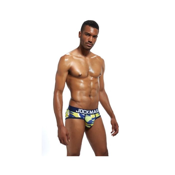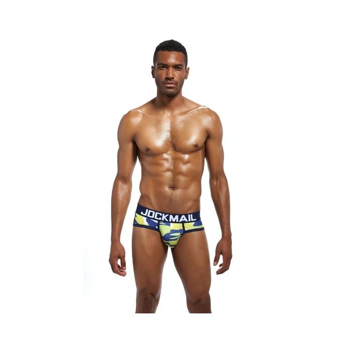De Jockmail JM321 Camouflage Slip - Marine Blauw heeft een sexy voorkomen door het strakke en lage model waarin jouw lekkere kontje goed uit de kleurrijke camouflage print zal komen. De zachte stof is heerlijk soepel, ademend en zweet resistent voor een geweldig draagcomfort. Ook de elastische tailleband en de zomen langs de randen en de buidel dragen bij aan het hoogwaardige comfort door de extra stevigheid die ze aan de slip geven voor een perfecte pasvorm.