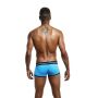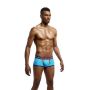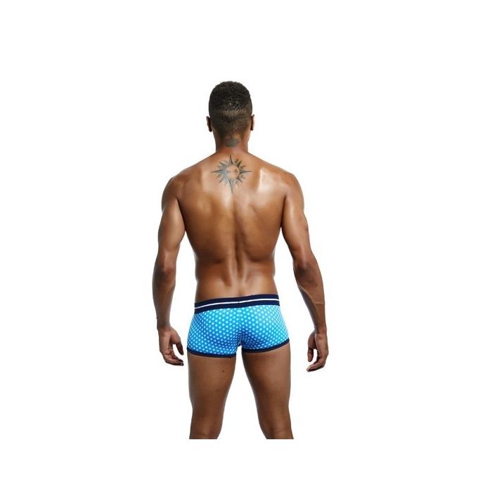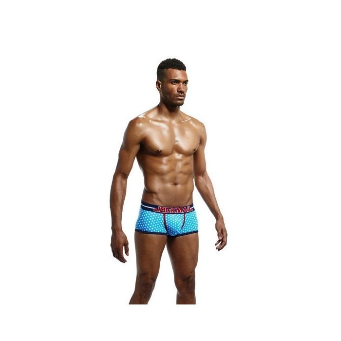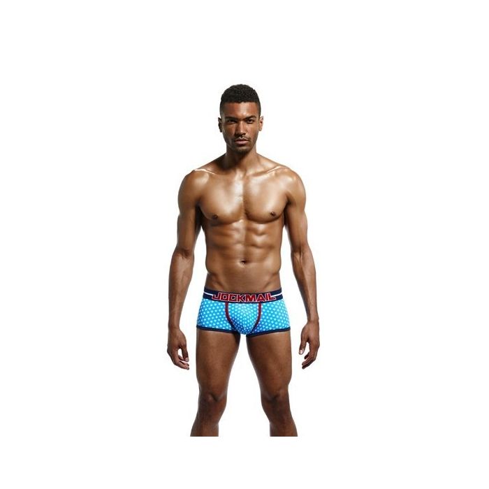De Jockmail JM407 Americana Boxer - Aqua heeft een sportieve Amerikaanse look door het witte sterren patroon op de lichtblauwe achtergrond en de klassieke afwerking met soepele rode zomen. De Jacquard geweven, donkerblauwe tailleband zit lekker laag om de heupen en is afgewerkt met een stijlvolle witte lijn rondom en het Jockmail logo voorop in het rood. Het zachte katoen is van hoge kwaliteit en is gemixt met Spandex voor een geweldig hoog draagcomfort en een perfecte strakke pasvorm. De sportieve boxershort is geschikt om in te sporten door het luchtige en zweet bestendige materiaal.