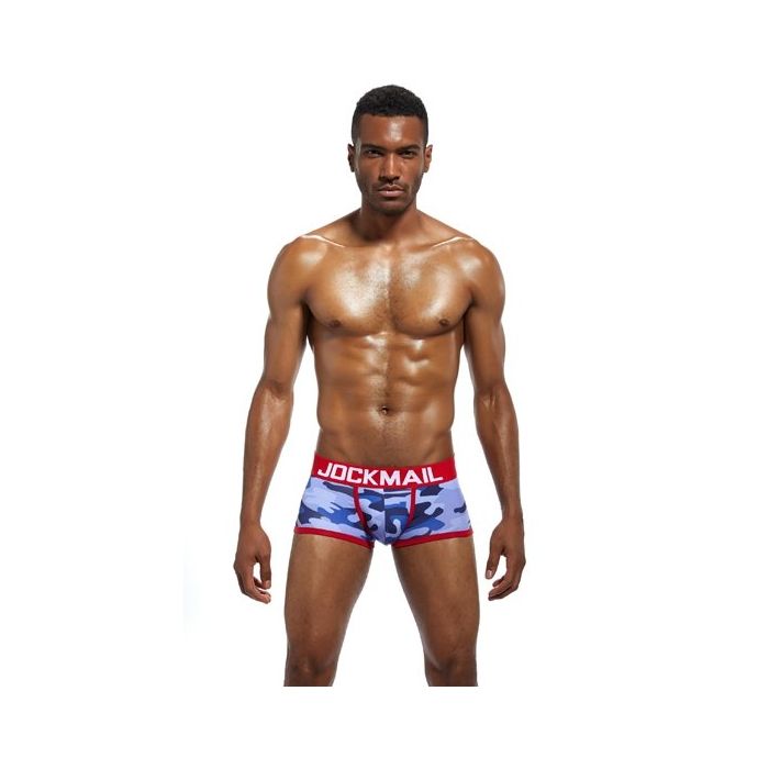 In de Jockmail JM413 Camouflage Boxer - Rood zit je zeker goed! Deze boxershort heeft een kekke camouflage print in blauw en paars en is afgewerkt met verstevigende zomen en een elastische tailleband in het rood. Naast een opvallend design zit deze boxer ook nog eens opvallend lekker, door he gebruik van super zacht, lucht doorlatend en zweet bestendig katoen met stretch kwaliteit.