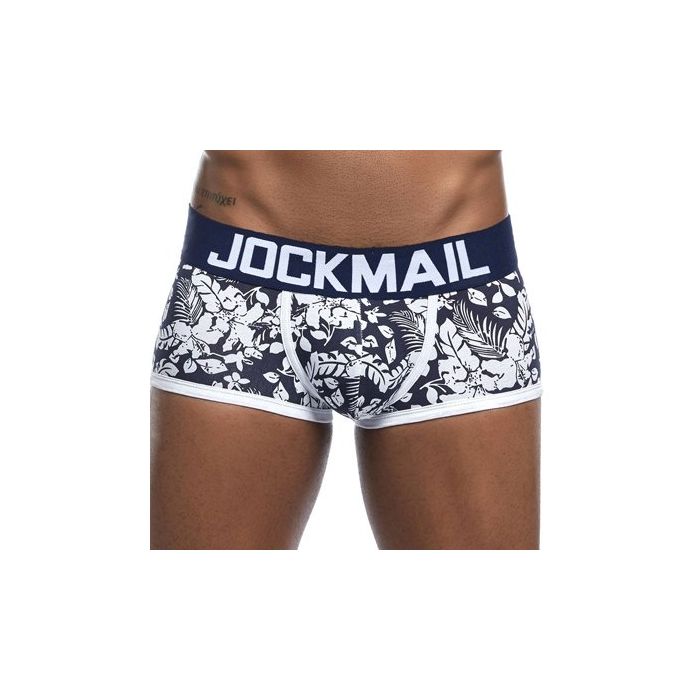 De JM447 Floral Boxer - Marine Blauw van het merk Jockmail heeft een Hawaiian stijl bloemen print voor een heerlijk vakantie gevoel. Deze boxershort is bovendien geschikt voor hoge temperaturen door het lucht doorlatende, zachte katoen met zweet bestendige eigenschap. Het katoen is gemixt met Spandex voor een super comfortabele nauwsluitende pasvorm. De elastische tailleband zit lekker laag om de heupen voor een sexy look.
