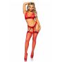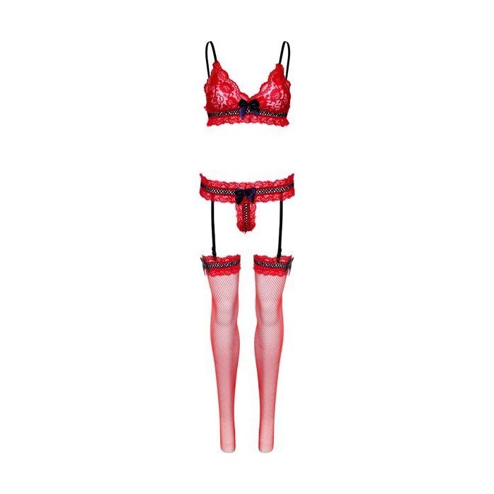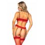 Naast dat de set als een droom zit, zie jij er ook uit als een droom in de bralette top en string van kant en spannende netstoffen kousen. Het kant, de kanten ruches en de kousen van netstof zijn uitgevoerd in een prachtige rood tint en hebben zwarte accenten. Aan de string zijn 4 jarretelbandjes gehecht, waaraan je gemakkelijk de kousen kunt bevestigen.