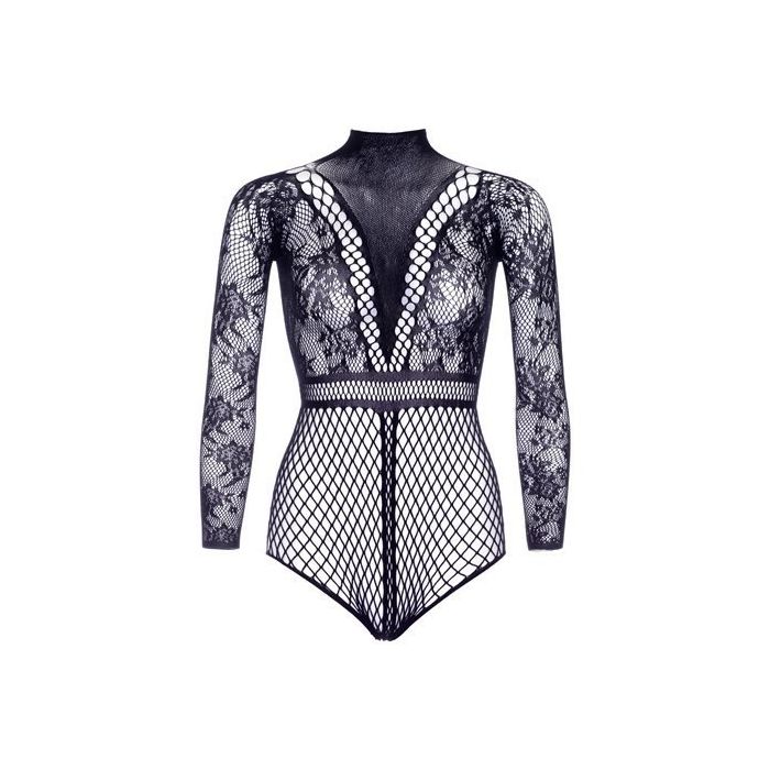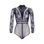 De Kanten Bodysuit met Netstof - Zwart komt uit de collectie van Leg Avenue. De body voelt heerlijk zacht aan en zit lekker strak rond jouw vrouwelijke vormen. De lange mouwen en het opstaande kraagje in combinatie met het kant geven een chique look. Het doorzichtige nylon en netstof geeft juist een heerlijk sexy twist. In huis kruis is een sluiting aangebracht, zodat jouw meest intieme zones gemakkelijk toegankelijk zijn.
