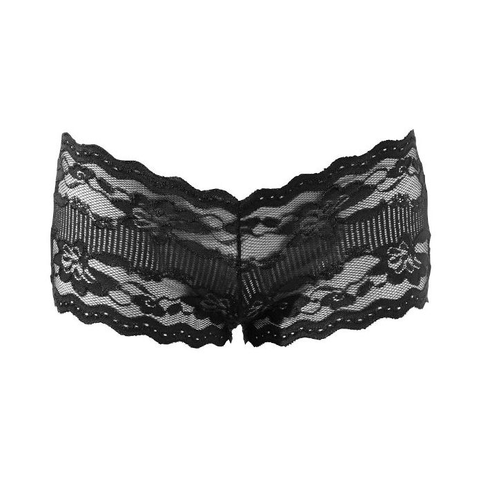 Dit kanten broekje van Cottelli Collection is geheel gemaakt van licht doorschijnend kant dat heerlijk zacht aanvoelt en lekker strak om je lichaam zit. Langs de randen is het broekje netjes afgewerkt met sierlijke golvende randjes. Aan de voorzijde lijkt dit een gewone dames boxer van prachtig bloemen kant, maar wanneer jij je omdraait zal je partner blij verrast worden. Het broekje heeft namelijk een open achterkant en is zo vormgegeven dat je billen extra geaccentueerd worden en er nog verrukkelijker uit zullen zien. Is jouw partner helemaal weg van jouw ronde billen, laat hem/haar wild worden van opwinding door in deze kanten slip met open achterkant te verschijnen!