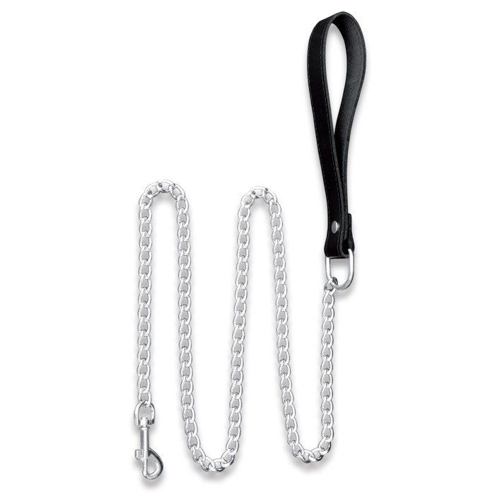 Prachtige stalen hondenriem met karabijnhaak en zwart leren handvat. Het design is simpel en strak. Met deze riem heb je jouw sub altijd onder controle. Zoek er wel even een mooie halsband of choker bij uit.... Anders ontsnapt je sub misschien toch nog, en dat is niet de bedoeling natuurlijk.