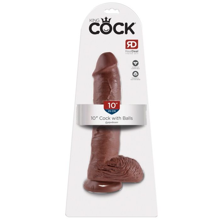 De 10" King Cock dildo is zeer gedetailleerd en levensecht met ballen, realistische aderen en een dikke eikel die er niet alleen goed uitzien, maar ook goed aanvoelen en extra stimulatie bieden. Vergeleken met de meeste andere dildo's heeft de 10" dildo niet alleen een sterke zuignap, maar is hij ook compatibel met strap-on harnassen, waardoor hij voor veel verschillende doeleinden gebruikt kan worden.