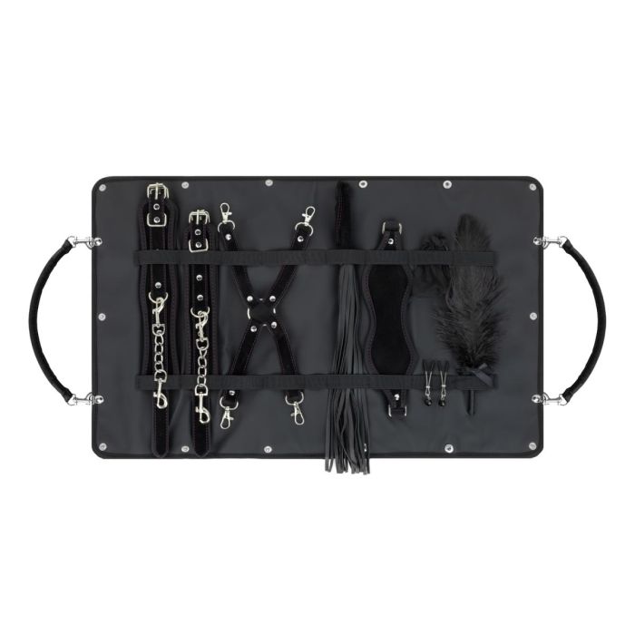 - Bevat handboeien, enkelboeien, blinddoek, zweep, tickler, tepelklemmen en hog
