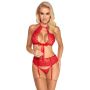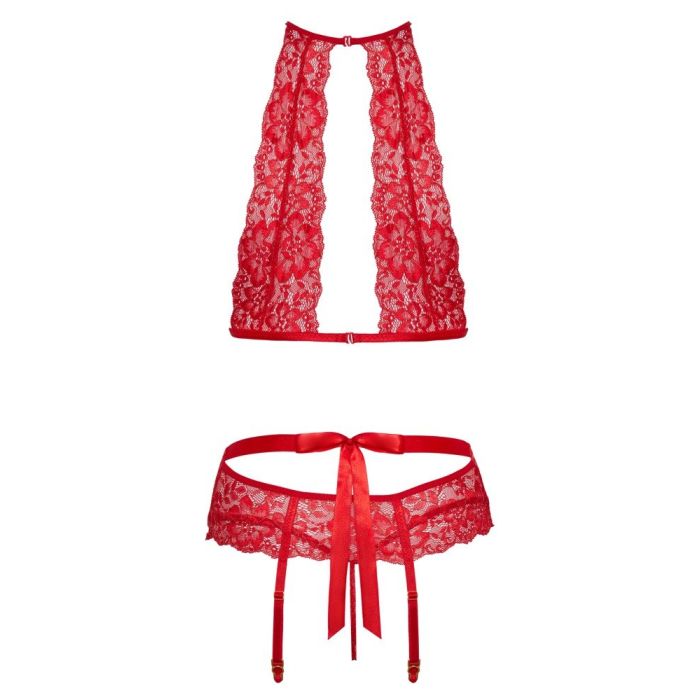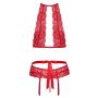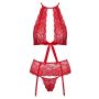 Deze exclusieve set in goudreflecterend rood biedt een onweerstaanbare stijl. De beha, jarretelgordel en string zijn allemaal gemaakt van zacht en fijn rood kant met prachtige gouden reflecties en details. Dit zorgt voor een luxueuze uitstraling en een verleidelijke look.