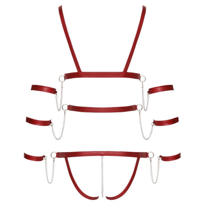 De verstelbare bandjes met drukknopen zorgen ervoor dat je de body perfect kunt aanpassen aan jouw lichaam. Daarnaast heeft de body 6 enkelbandjes voor handen/armen met karabijnkettingen, die afneembaar zijn van de ringen aan de zijkant van het lichaam.
