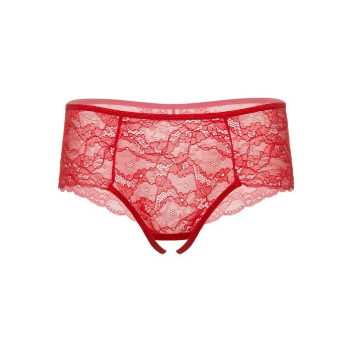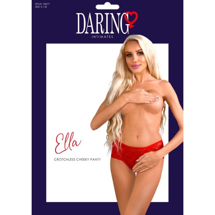 De Kruisloze Cheeky Slip Ella - Rood van Daring Panties is een sexy slip met open kruis zodat jij snel toegankelijk bent voor je partner. De slip is gemaakt van semi transparant materiaal en heeft een prachtig bladpatroon. De slip is beschikbaar in 2 kleuren en 2 maten en heeft door zijn elastaan een mooie pasvorm.