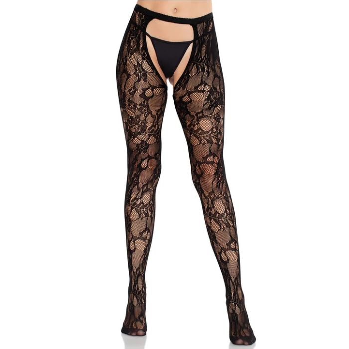Kruisloze Kanten Panty met Rozenpatroon - Zwart