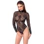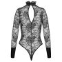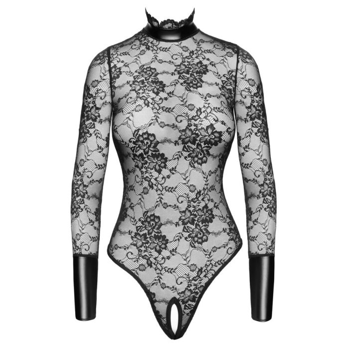 Deze kruisloze stringbody van Noir is gemaakt van fijn zwart bloemenkant. Deze prachtige body is niet alleen een lust voor het oog, maar biedt ook een ongeëvenaard draagcomfort dankzij de zachte en stretchy stof die perfect om je lichaam valt. De stijlvolle powerwetlook details, zoals de nekband en de kanten volant opstaande kraag, geven een verfijnde touch, terwijl de brede manchetten aan de lange mouwen een extra dosis flair toevoegen. De extra hoge beenuitsnijdingen accentueren je billen en benen op een verleidelijke manier, en het open kruis zorgt voor een speelse, sensuele uitstraling. Maak je look compleet door de opstaande kraag in de nek dicht te knopen voor een chique afwerking. Deze stringbody is de perfecte keuze voor een avondje uit of een speciale gelegenheid waar je wilt stralen!