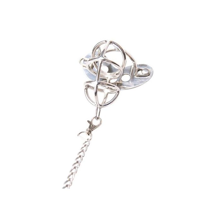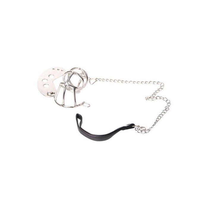 Stalen kuisheidskooi met ketting er aan bevestigd. Geniet van de onderdanige positie wanneer de penis ingesloten is in een kooi.Tegelijkertijd kan je partner jou aan de ketting overal naartoe dirigeren! Geniet samen van deze kuisheidskooi en maak jullie sessies extra spannend.