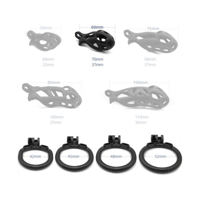 Deze kuisheidskooi wordt geleverd met bevestigingsringen met verschillende diameters, namelijk 42, 45, 48 en 52 mm. Hierdoor kan de gebruiker de ring kiezen die het beste bij zijn lichaam past, voor een optimale pasvorm en comfort. De kooi wordt afgesloten met een sleutelsluiting, waardoor de drager de controle heeft over het openen en sluiten van de kooi.