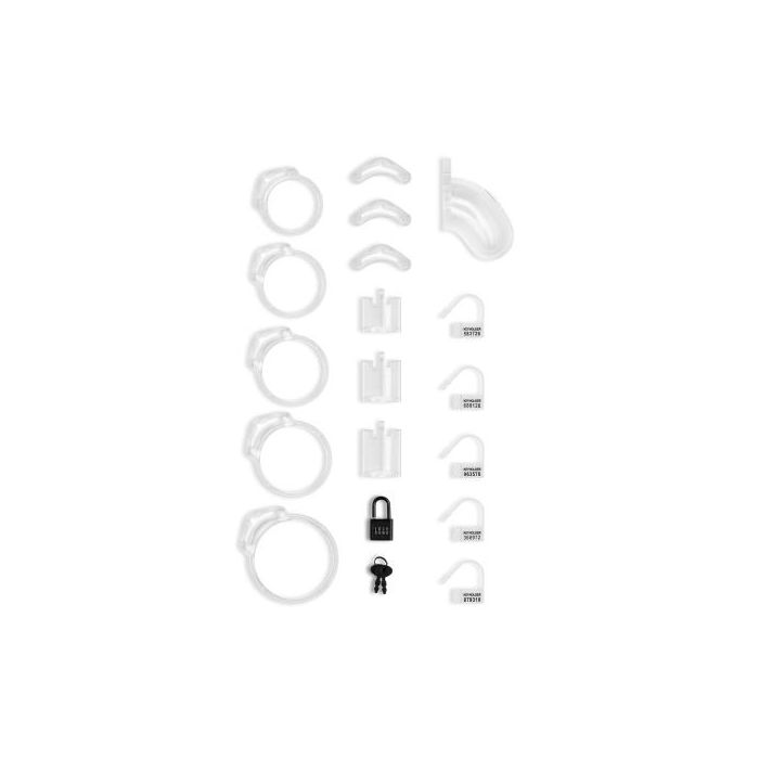 Deze geweldige set wordt geleverd met vijf ringen in verschillende maten (4,5 - 6,5 cm), zodat je altijd de perfecte pasvorm kunt vinden. Daarnaast bevat de set een metalen hangslot met twee sleutels en vijf plastic genummerde hangsloten. De plastic sloten kunnen eenvoudig met een schaar worden verwijderd na gebruik, maar de unieke nummers op elk slot zorgen ervoor dat de drager de chastity cage niet stiekem kan verwijderen en een nieuw slot kan aanbrengen zonder betrapt te worden.