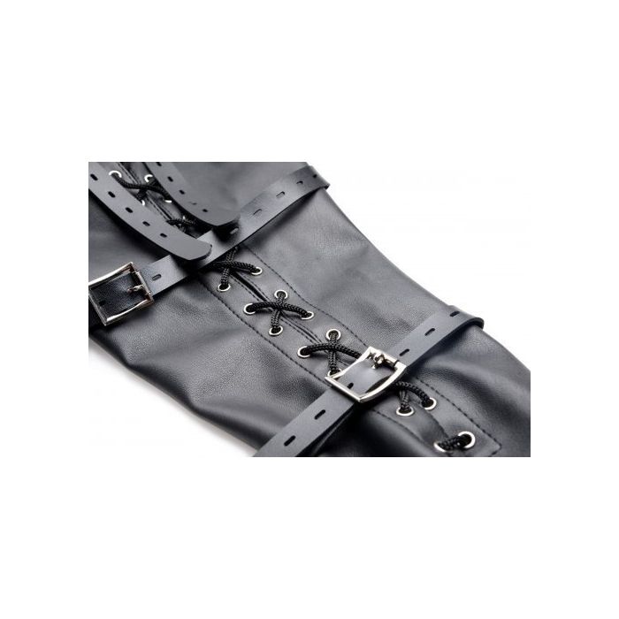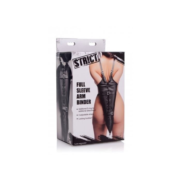 Zet je schatje vast in jouw favoriete standje. Armen gebonden naar achteren maar dit keer met de garantie dat ze werkelijk niet los kan komen. De kunstleen arm sleeve brengt haar armen helemaal achter de rug vast vanaf de bovenarmen tot helemaal naar beneden. Zelfs haar handen zullen verpakt zitten in deze geweldige arm sleeve. De armbinder is vast te zetten door de veter strak aan te trekken naar wens en vervolgens de twee riempjes vast te zetten als extra beveiliging. De banden die over de schouder heen komen zijn verstelbaar voor de perfecte pasvorm. Aan het uiteinde zit een d-ring zodat jij er ook andere bdsm producten aan vast kan zetten.