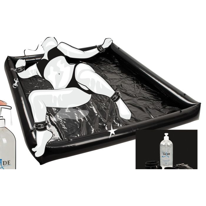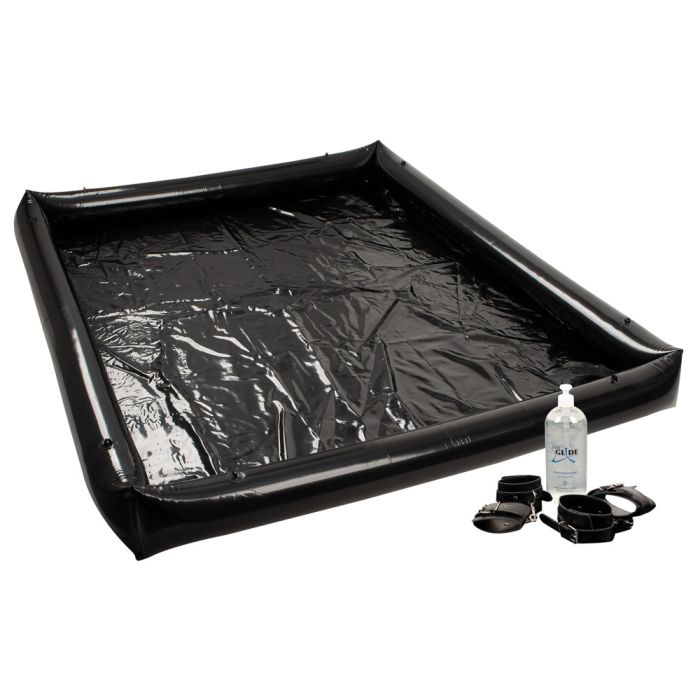 De Laken Glossy Games van Fetish Collection is een complete set. Het laken heeft een opblaasbare rand van 15 cm die je overal kunt gebruiken. Hij is geweldig voor natte, vette en glibberige spelletjes. Ook heeft deze prachtige set hand en voetboeien die worden bevestigd met karabijnhaken.