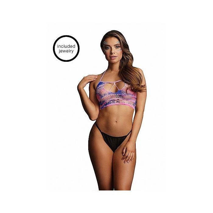 Ben je op zoek naar een draagbaar item voor het festival seizoen? Ga dan voor de Strappy Halter Top met Sieraad van Le Désir. Deze hippe tie dye top is perfect te dragen met een kort jeans shortje of een wijde jeans met gaten. Een paar coole sneakers eronder en jij bent festival proof. Maar natuurlijk kan jij de top ook dragen in de slaapkamer met een paar stoute pumps. Je partner zal zeer verrast zijn.... De top is zeer rekbaar en heeft dan ook een perfecte pasvorm voor de maten S tot en met L.