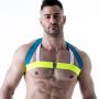 De blauwe halterband kruist met de smallere witte band, voor een uniek design. De band rondom is neon geel met op de voorkant een reflecterend Leader Torch embleem.