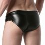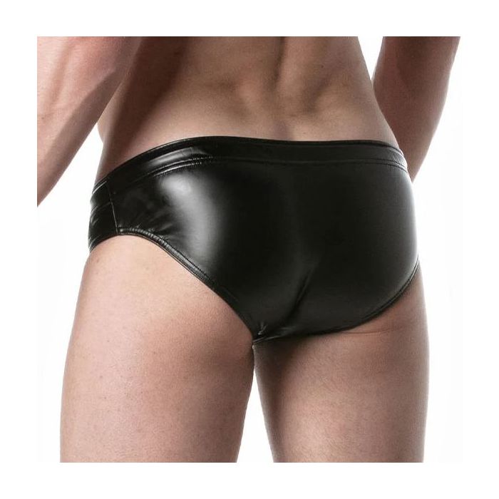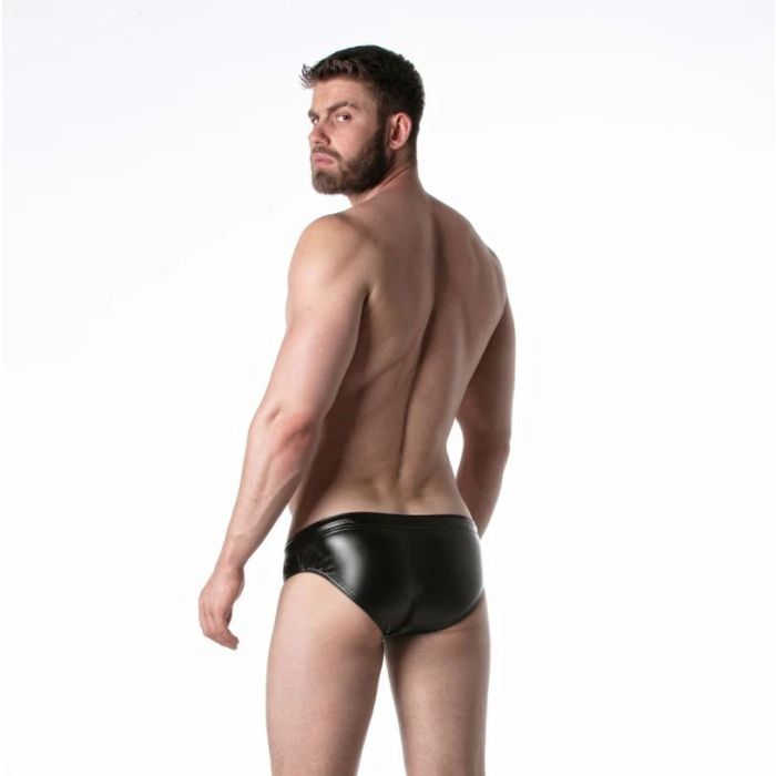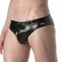 Deze stretchy lederlook slipjes zijn perfect voor feestjes en hebben een sterke fetisj uitstraling. Ze hebben een lage taille en zijn gemaakt van een comfortabele leatherette stof. Aan de linkerkant van de taille bevindt zich een polyester LEADER merklabel. De tailleband is voorzien van een polyester trekkoord met metalen aglet tips, waardoor je de slipjes kunt verstellen naar jouw gewenste pasvorm. Deze slipjes combineren stijl en comfort en zijn ideaal voor een avondje uit of een speciale gelegenheid.
