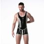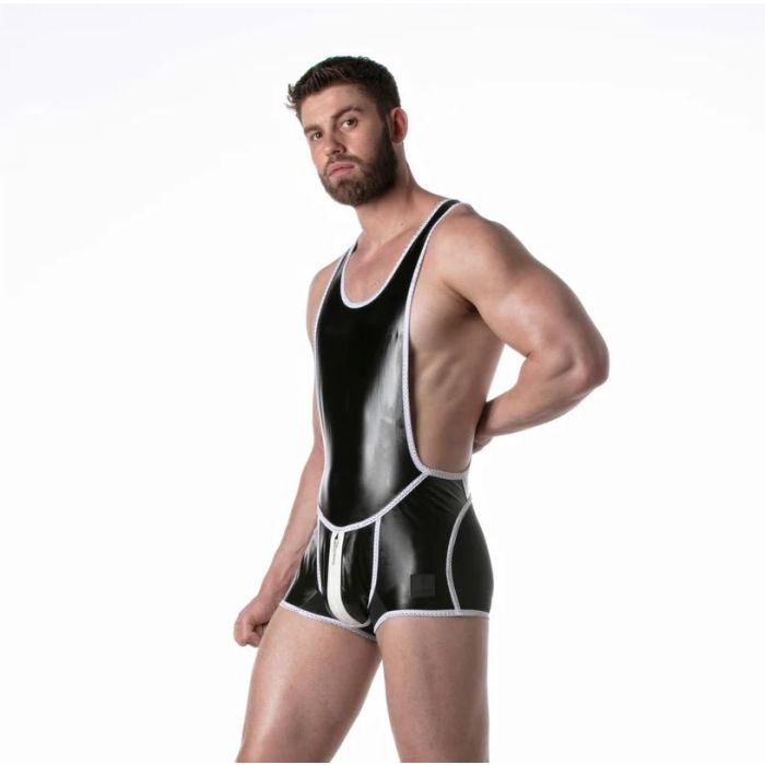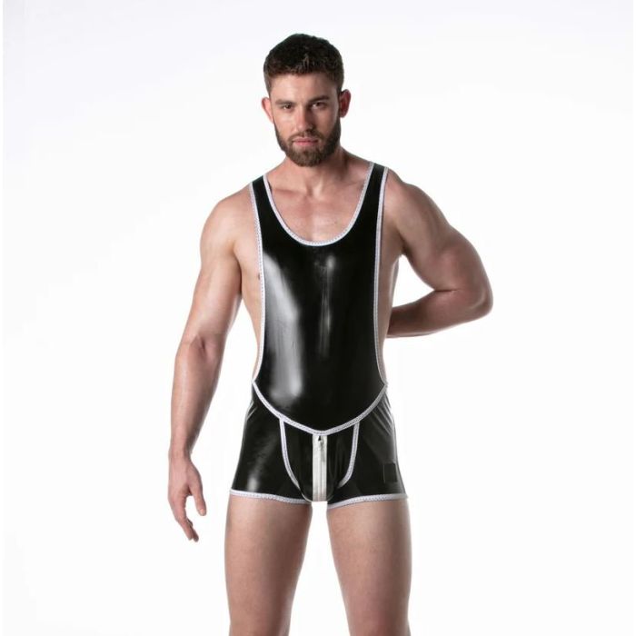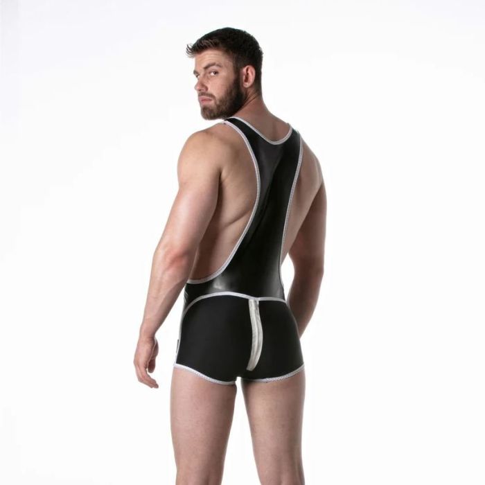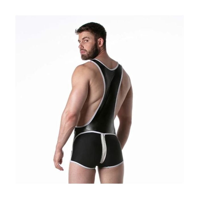 Deze stretchy leren worstelsinglet met spandex detail rond de billen is perfect voor degenen die op zoek zijn naar een opwindende en uitdagende look. Het materiaal is gemaakt van leerachtig materiaal dat meerekt, waardoor het comfortabel en flexibel is tijdens het worstelen. De spandex details rond de billen voegen een extra vleugje stijl en sensualiteit toe aan het ontwerp. Wat deze singlet echt uniek maakt, zijn de twee aparte ritsen die toegang bieden tot het kruis en de rug. Dit zorgt voor een gemakkelijke en discrete manier om de singlet aan en uit te trekken, zonder de hele outfit te hoeven verwijderen. De ritsen zijn stevig en duurzaam, zodat je je geen zorgen hoeft te maken over onverwachte ongelukjes tijdens het worstelen. Een subtiele maar opvallende toevoeging aan deze singlet is het discrete silicone LEADER merklabel op het linker dijbeen. Dit voegt een vleugje luxe en exclusiviteit toe aan het ontwerp. Of je nu een worstelaar bent die op zoek is naar een nieuwe outfit voor de ring, of gewoon iemand die houdt van de sterke fetisj uitstraling, deze stretchy leren worstelsinglet met spandex detail is een absolute must-have.