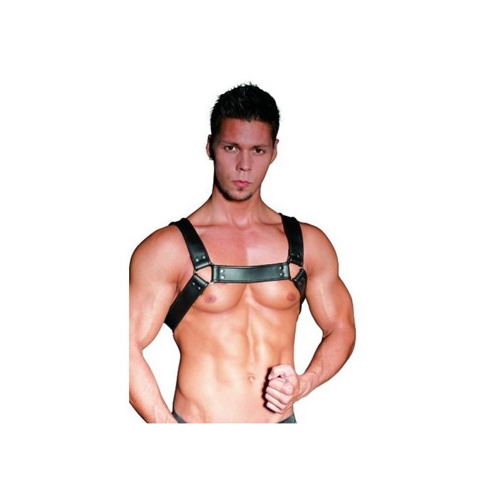 Dit bondage harnas is speciaal gemaakt voor BDSM liefhebbers en is gemaakt van zwart gespleten leer. De leren banden worden met elkaar verbonden door metalen verbindingsringen. Het harnas is eenvoudig te verstellen en heeft daarom om uitstekende pasvorm.