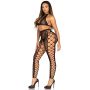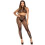 De halterstijl bh met hoge halslijn accentueert je schouders en décolleté, terwijl de crisscross fishnet details aan de voorkant een speelse, maar gedurfde uitstraling geven. De bijpassende high-waisted leggings zijn vervaardigd uit een sheer leopard patroon van kant, met grote ovale fishnet uitsparingen die elegant langs je benen lopen. Het open kruisontwerp voegt een extra vleugje sensualiteit toe, perfect voor een avondje uit of een speciale gelegenheid.
