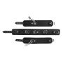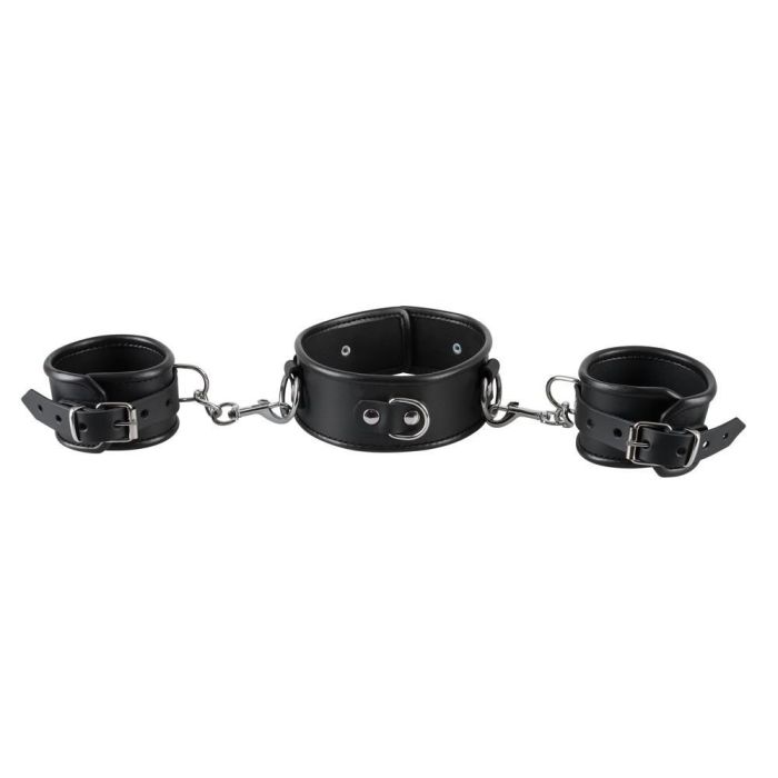 Leren handboeien set bestaande uit een halsband en twee handboeien van leer. De handboeien kunnen bevestigd worden aan de halsband met behulp van een karabijn haak aan de boeien. De nek boei heeft ook haken aan de zijkant en een D-vormige ring aan de voorkant. De randen van de handboeien zijn omgezoomd. Beperk de bewegingsvrijheid van jouw partner of sub met deze halsband met handboeien!