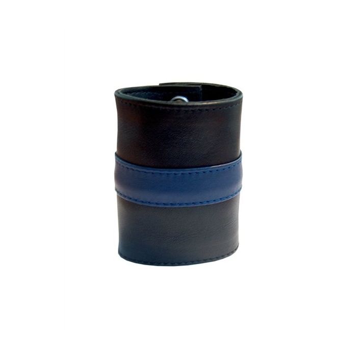 Voor elk feestje waarbij jij weinig tot niks aanhebt is deze leren polsband een echte uitkomst. Hij maakt je outfit niet alleen compleet maar hij is ook nog eens handig om je pasjes en geld in op te bergen. Het soepele leer zal fijn om je pols heen zitten en zal na elke keer een stukje fijner zitten. Deze polsband is voorzien van een blauwe streep dus combineer het met je tevens Zwart / Blauw gestreepte outfit. Hij sluit met drie drukknopen en is verkrijgbaar in verschillende maten.