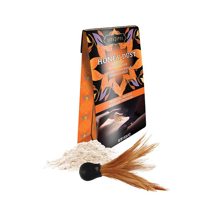Het lichaamspoeder Honey Dust Tropische Mango van Kamasutra is kusbaar, vocht afvoerend en laat de huid zacht en licht geparfumeerd achter voor je partner. Het voorspel kan beginnen met Honey Dust Tropische Mango. Met de meegeleverde luxe applicator veer kan jij je lichaam snel en eenvoudig voorzien van dit heerlijke poeder. Of laat het je partner doen. Met Lichaamspoeder Honey Dust Tropische Mango begint jullie avond extra zacht en spannend.