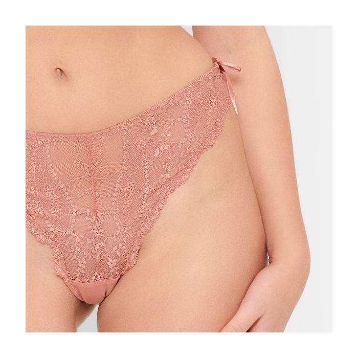 Het kant is sierlijk afgewerkt aan de randjes en schijnt lichtjes door. De achterkant is gemaakt van semi-transparant micro mesh. Het mesh en het kant voelen beiden heerlijk zacht aan. In de zijkanten worden de twee soorten stoffen met elkaar verbonden met speelse striklintjes. In het kruis is een laagje luchtig katoen aangebracht voor een extra hoog draagcomfort.