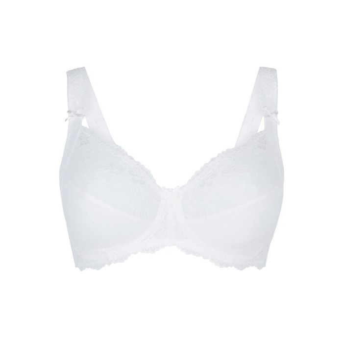 Het sierlijke bloemen kant heeft geschulpte randjes. Het witte kant geeft een heerlijk romantische look. De schouderbandjes zijn breder dan standaard bh bandjes en het kant loopt erover door. De brede band rondom draagt bij aan de goede steun die deze bh biedt. Op de rug is een haaksluiting met 3 standen gemaakt.